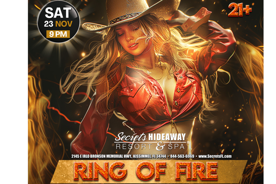 Secrets Hideaway presents the "Ring of Fire" event on Saturday, November 23rd. Calling all cowgirls and cowboys! Grab your hat and saddle because we're breaking out our boots for a night of wild, western fun. Embrace your inner country star and join us for an evening inspired by the legendary Johnny Cash. With his iconic "Ring of Fire" as our theme, we're ready to kick up our heels and dance the night away to some boot-stompin’ music.