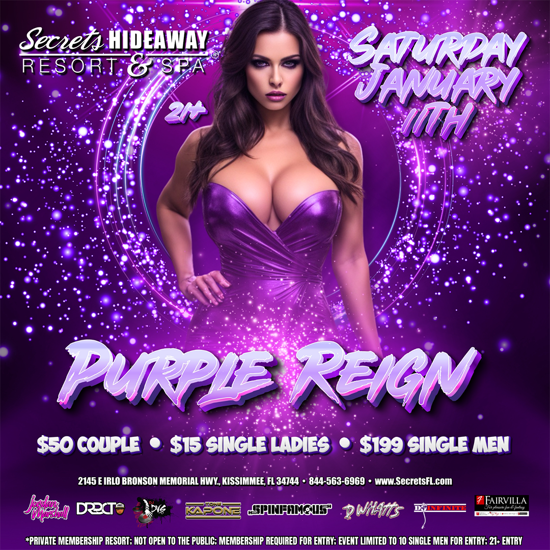 Secrets Hideaway presents the "Purple Reign" event on Saturday, January 11th. This night is dedicated to celebrating the opulence and allure of the color purple, a symbol of royalty, mystery, and magic. Embrace the richness of this majestic hue in an atmosphere that captures both the decadence and the mystique of a regal evening. Guests are encouraged to don their most extravagant purple attire, from elegant gowns to daring ensembles, and immerse themselves in a world where every detail exudes sophistication and luxury.