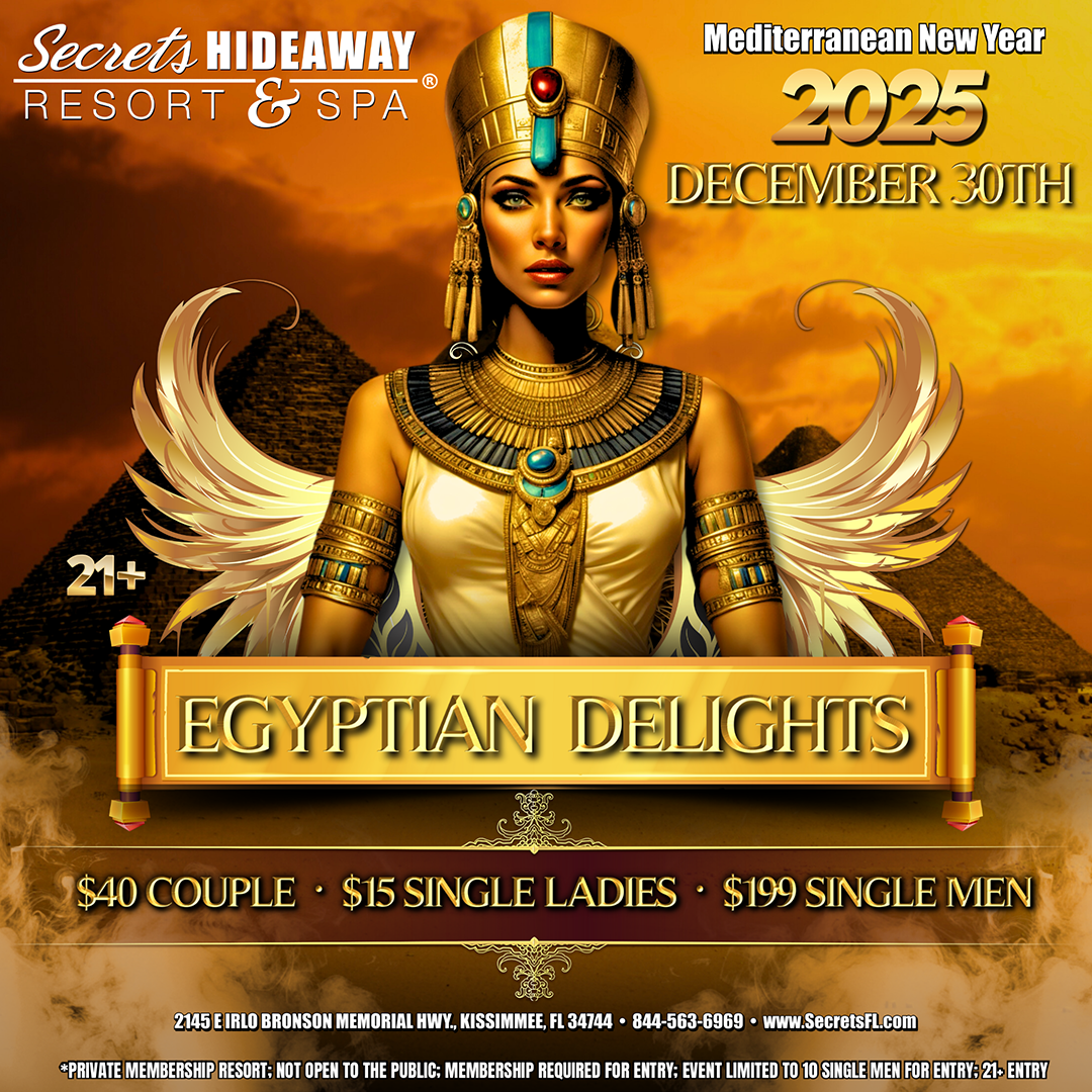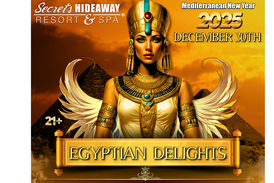 As you mingle among other guests dressed as Egyptian royalty, enjoy the hypnotic rhythms of traditional Middle Eastern music and captivating dance performances that will transport you to the banks of the Nile. Explore the rich history and mystery of Egypt through thematic activities and visuals that celebrate its storied past. Whether you're partaking in a feast fit for a king or engaging in conversations that span millennia, "Egyptian Delights" promises a magical evening filled with cultural splendor and historical wonder. Join us at Secrets Hideaway to experience a New Year's Eve celebration unlike any other, steeped in the grandeur and enchantment of ancient Egypt.
