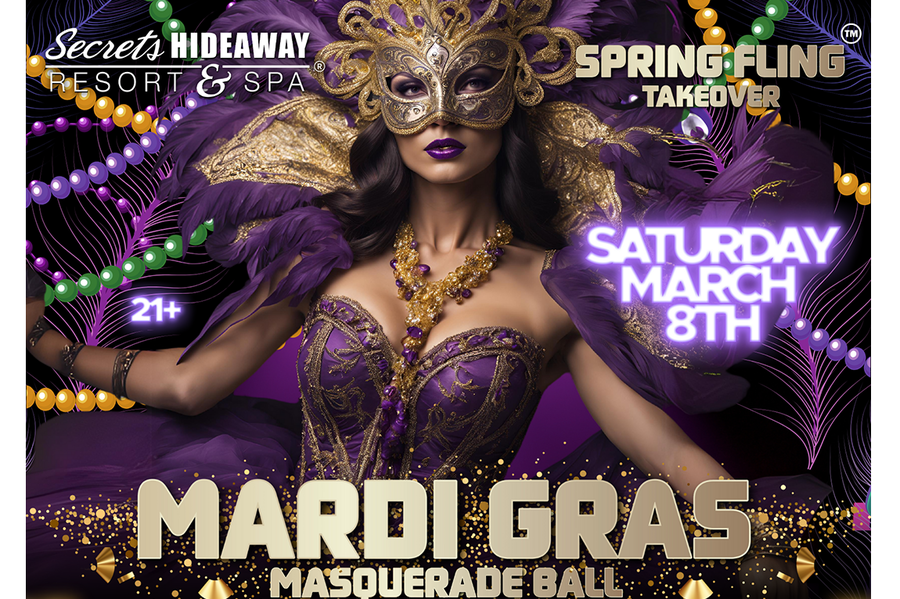 Celebrate the vibrant spirit of Mardi Gras at Spring Fling™ "Mardi Gras" on Saturday, March 8th at Secrets Hideaway Resort and Spa®. If you can't make it to New Orleans, there's no better place to capture the essence of this festive celebration. It's a night to let loose, so break out your most dazzling masks, colorful beads, and feathered boas, and immerse yourself in an evening of New Orleans-inspired revelry.