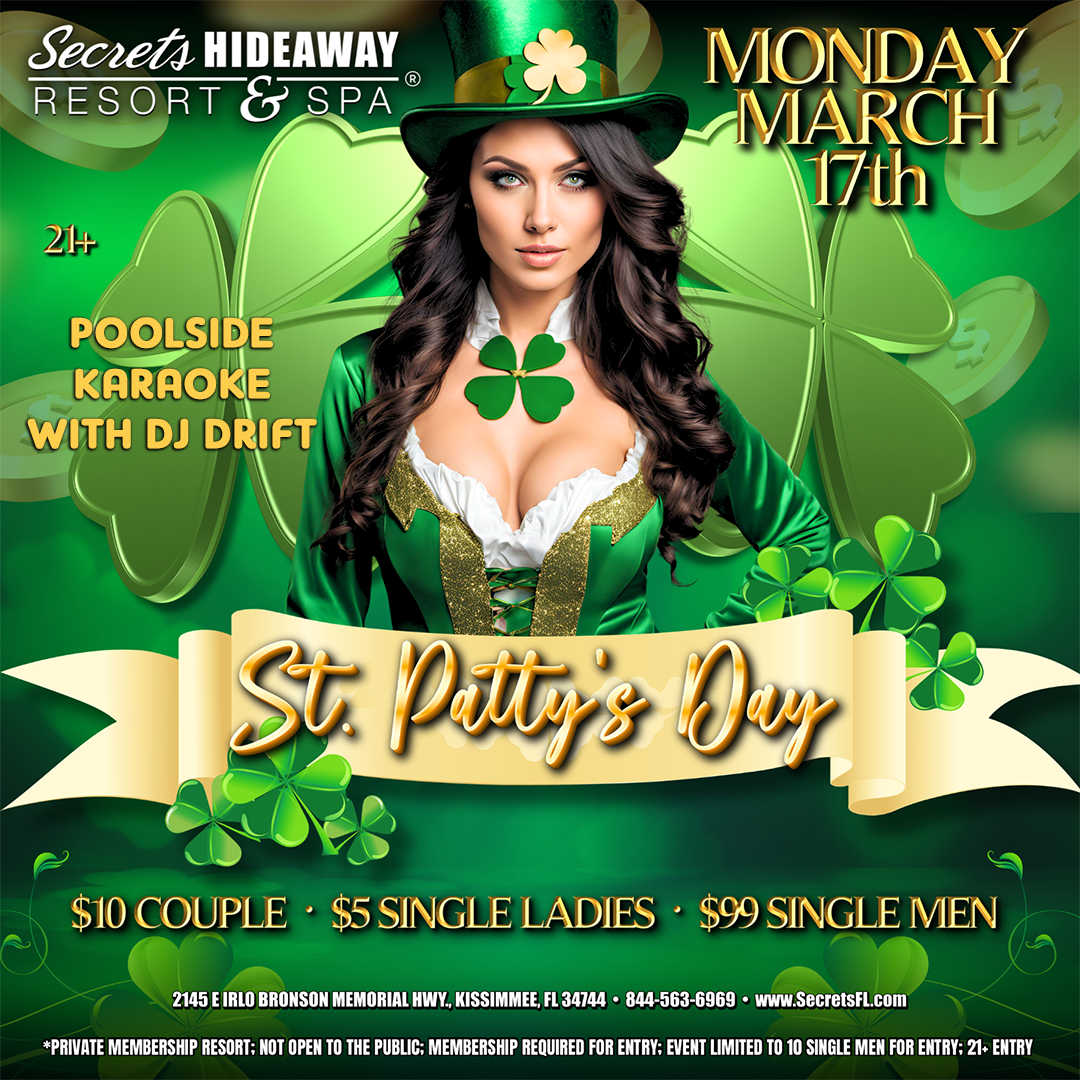 This is your opportunity to let loose, showcase your singing talents, or cheer on others as they take the stage, all while enjoying themed decorations and special St. Patty's Day cocktails crafted by our expert bartenders. Whether you're a karaoke veteran or a first-timer, the night is sure to be filled with laughter, music, and memorable moments. Wear a touch of green and bring your best Irish cheer to Secrets Hideaway for a St. Patty's Day filled with song, celebration, and maybe a little bit of Irish luck!