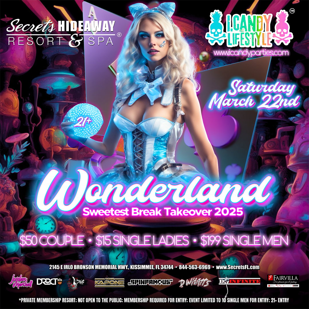 i.Candy Lifestyle™ Sweetest Break Takeover 2025 presents "Wonderland" on Saturday, March 22nd, at Secrets Hideaway lifestyle resort. Prepare to be whisked away into the whimsical and mysterious world of Wonderland, where fantasy becomes reality, and every turn brings a new thrill. This immersive event invites you to journey down the rabbit hole into an enchanting realm filled with peculiar delights and tantalizing surprises, creating the perfect backdrop for an adventurous and erotic tea party with friends both old and new.