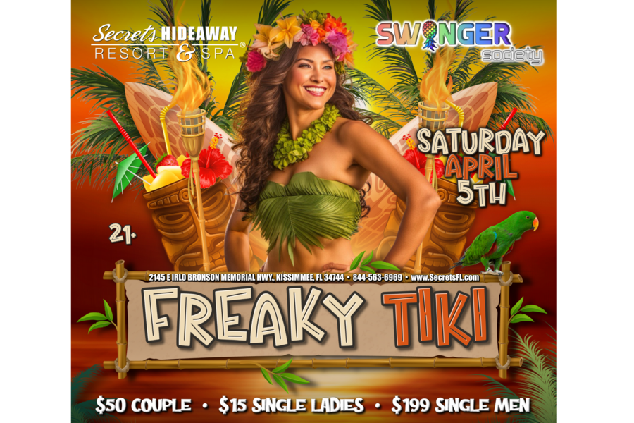 Swingers Society presents the "Freaky Tiki" event on Saturday, April 5th at Secrets Hideaway. Get ready to experience a tropical playground where sultry beats, vibrant island decor, and playful spirits come together for a night of uninhibited fun. Think exotic tiki torches, lush greenery, and a lush, laid-back vibe that invites you to let go of your inhibitions and embrace the freedom of the lifestyle.
