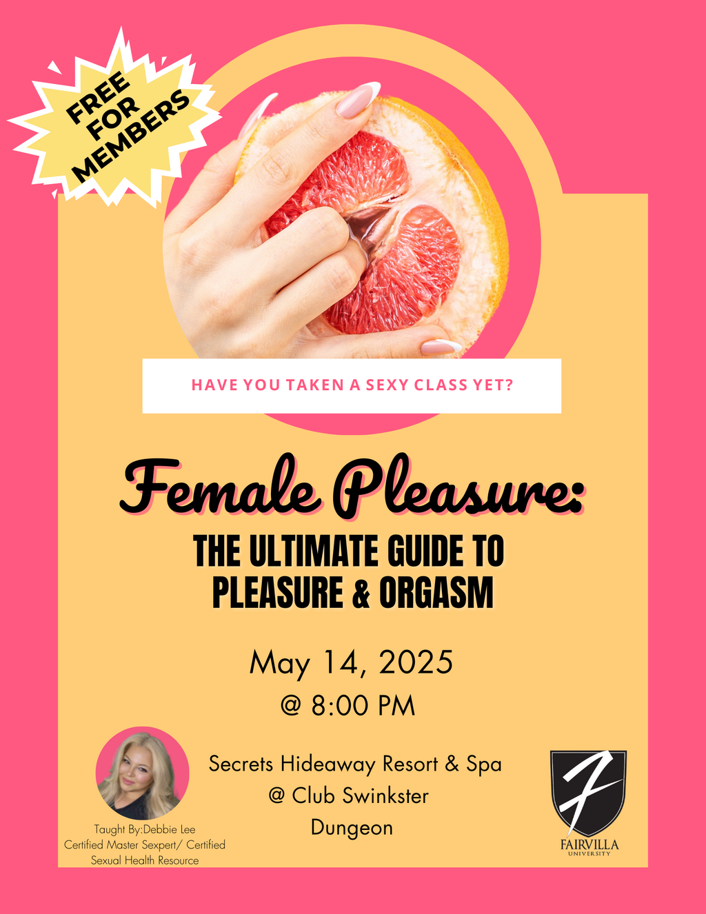 Join Fairvilla® inside Club Swinkster™ for Female Pleasure – The Ultimate Guide to Pleasure & Orgasm, starting at 8pm. Led by Certified Sexual Health Resource/Certified Master Sexpert, Debbie Lee, this empowering workshop dives deep into the realm of vulva and vaginal pleasure, offering insights on everything from anatomy and orgasm to overall sexual health and wellness. Whether you’re well-versed in the topic or just beginning to explore, Debbie Lee’s expertise, open-minded approach, and warm teaching style create a supportive environment where every question is valid and every curiosity is celebrated.