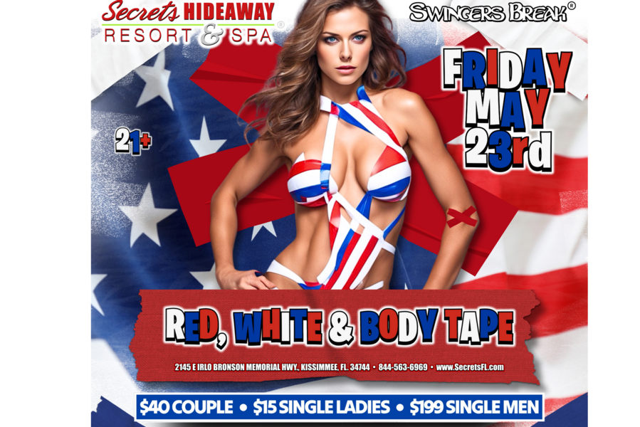 Secrets Hideaway presents Swingers Break® 2025 "Red White & Body Tape" on Friday, May 23rd—an event that pushes the boundaries of sexy creativity to thrilling new heights. Imagine a night where the only fabric you might be wearing is tape, strategically placed in dazzling red, white, blue, and any other enticing shade that catches your eye. From suggestive designs to intricate patterns, this is a party that showcases both your artistry and your seductive side, all in a welcoming, high-energy setting.