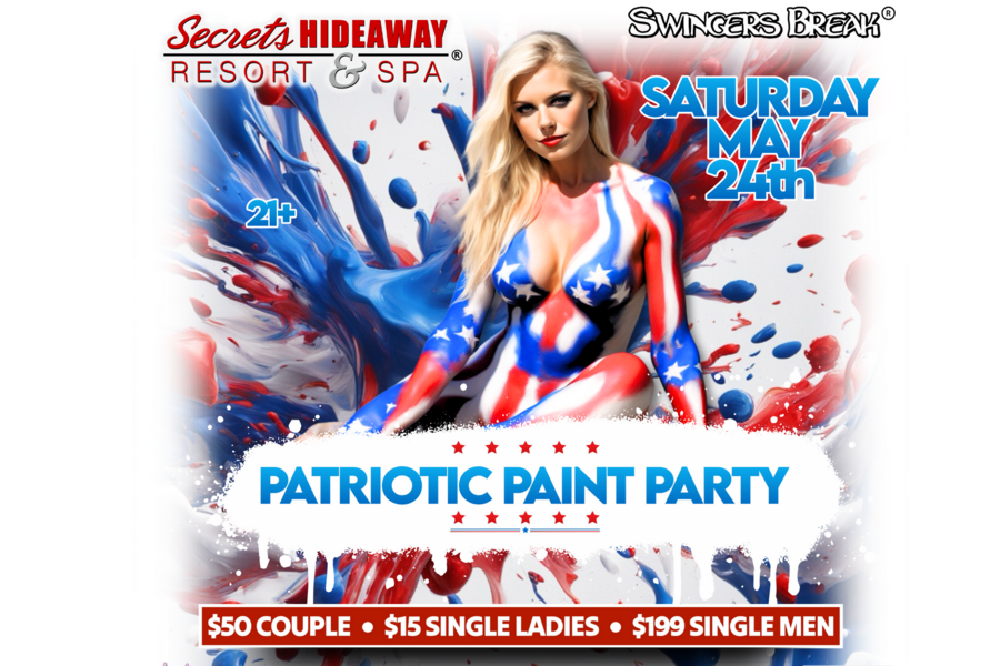 Secrets Hideaway presents Swingers Break® 2025 "Patriotic Paint Party" on Saturday, May 24th—an event where your body becomes the canvas for a night of erotic artistry. Imagine vibrant reds, whites, and blues brushed across bare skin, creating living works of sensual art that capture the spirit of summer and the excitement of the lifestyle. Whether you’re flaunting a playful design or going all-out with head-to-toe body paint, this party is all about celebrating freedom, creativity, and unabashed desire.