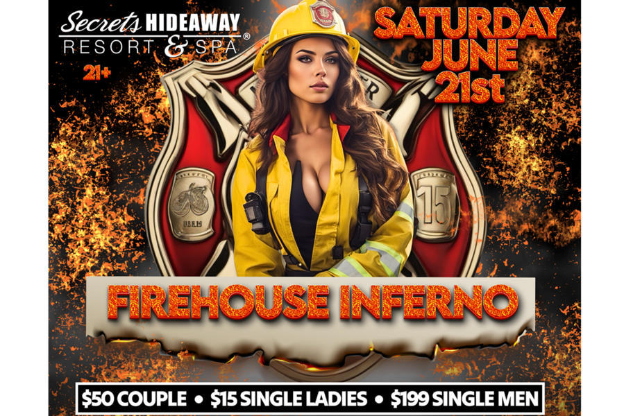 Get ready to ignite your senses at "Firehouse Inferno," a night where flames of passion burn bright and fantasies come alive! Join us on Saturday, June 21st, as Secrets Hideaway transforms into a sultry firehouse of desire, where the only alarm you'll hear is the one signaling unforgettable fun. Whether you’ve always dreamed of a daring firefighter ready to "find 'em hot and leave it wet" or you're simply looking to explore your wildest fantasies, this event promises an evening of untamed erotic exploration. Surround yourself with open-minded individuals who share your thirst for adventure and indulge in a night where anything is possible.