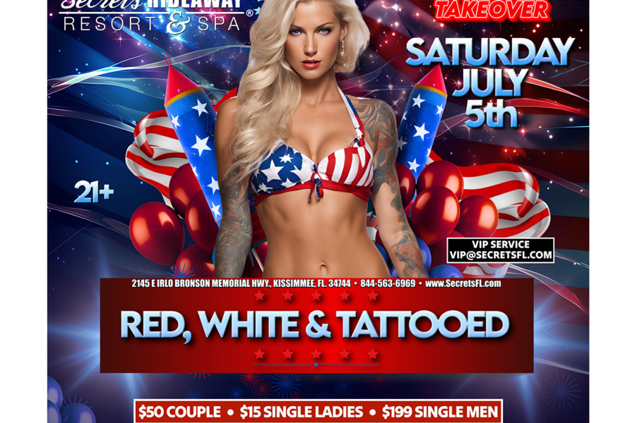 As the night unfolds, the venue transforms into a steamy playground brimming with possibilities. Let the music move you on the dance floor, surrounded by like-minded thrill-seekers eager to celebrate both independence and their love of ink. From flirtatious conversations at the bar to captivating encounters in every corner, “Red, White & Tattooed” promises an unforgettable evening of bold self-expression and electrifying sensuality. Indulge in the unrestrained energy of Secrets Hideaway for a night that leaves its mark in more ways than one.