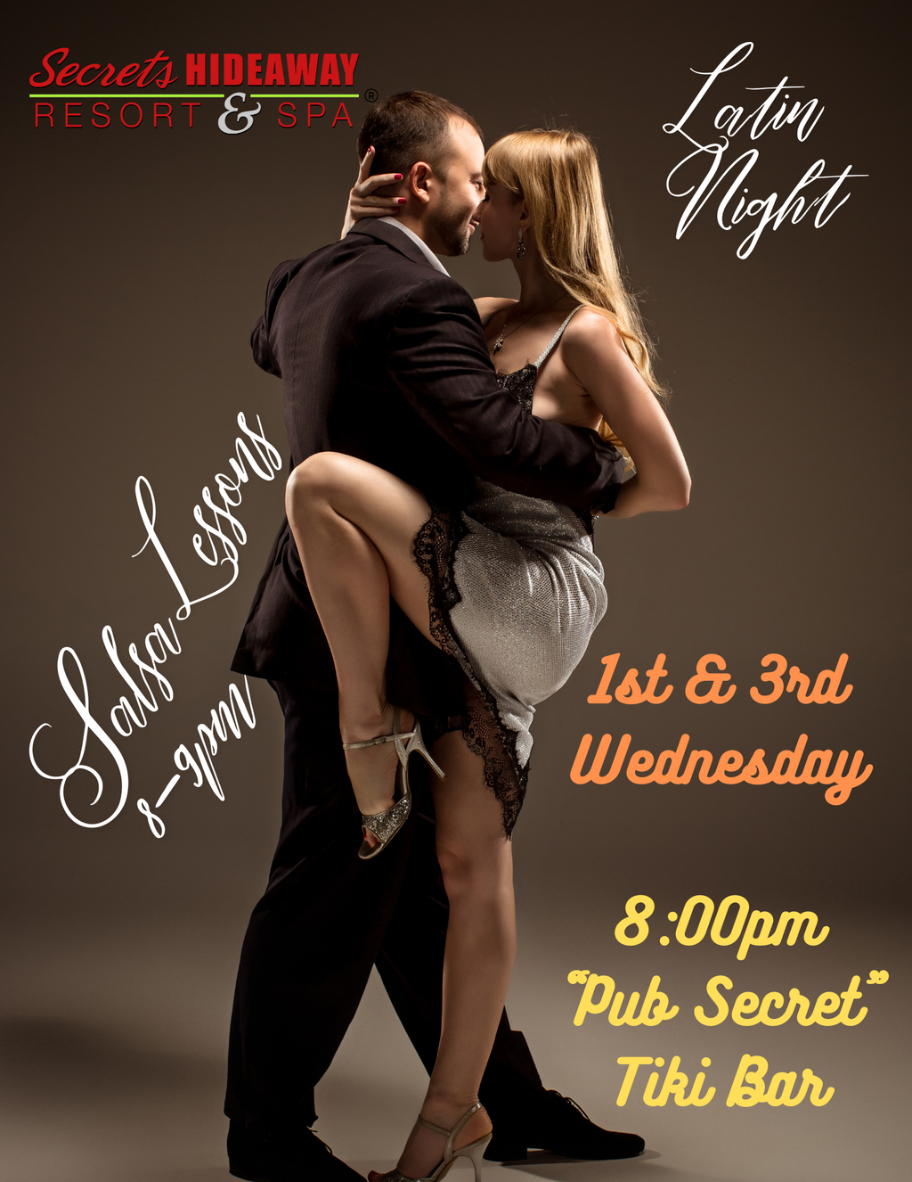Get ready to spice up your evening at "Pub Secret", our brand new tiki bar experience, tonight, starting at 8pm, with our FREE Salsa Lessons! Whether you’re a total beginner or already know some steps, our professional instructors will guide you through the sultry moves and vibrant rhythms of this classic Latin dance. Feel the energy surge through the dance floor as you connect with new partners, share smiles, and discover the joy of salsa. There’s no better way to set the mood for a fun and flirty night out!
