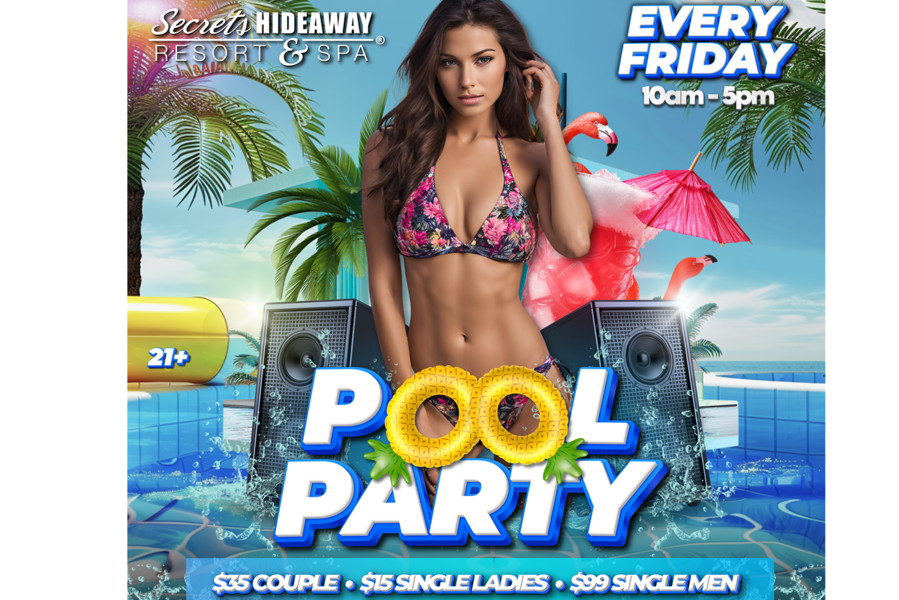 Kick off your weekend in style at the Friday Pool Party, an enticing affair hosted every Friday from 10 am to 5 pm at Secrets Hideaway Resort & Spa. Immerse yourself in the ultimate daytime indulgence as you join Orlando's most exhilarating clothing-optional pool party. From the moment the clock strikes 10 am, the party comes alive with refreshing cold drinks served at the lively tiki bar, a delectable lunch and dinner menu, and the infectious beats spun by our professional DJs, setting the perfect backdrop for a day of carefree fun and relaxation. At Secrets Hideaway, we offer not just a pool party but an experience where you can revel in the sun, enjoy tantalizing food and drinks, and groove to your favorite tunes, all in the company of friendly, open-minded individuals.