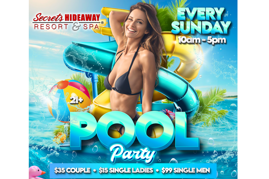 Sundays have never been more liberating! Join us every Sunday from 10 am to 5 pm for the ultimate relaxation and rejuvenation at Secrets Hideaway's Sunday Pool Party. Whether you're extending the weekend fun with Sunday Funday or winding down from a wild adventure, this day is tailored for pure bliss under the warm Florida sun. Forget about swimsuits – at this clothing-optional paradise, come as you are and stretch out in one of our two inviting pools, letting the radiant sunshine kiss your skin as you bask in complete relaxation. Our bubbling hot tubs offer a soothing escape, and the conversation pool provides the ideal setting to make new friends, sparking conversations that linger with the promise of exciting connections.