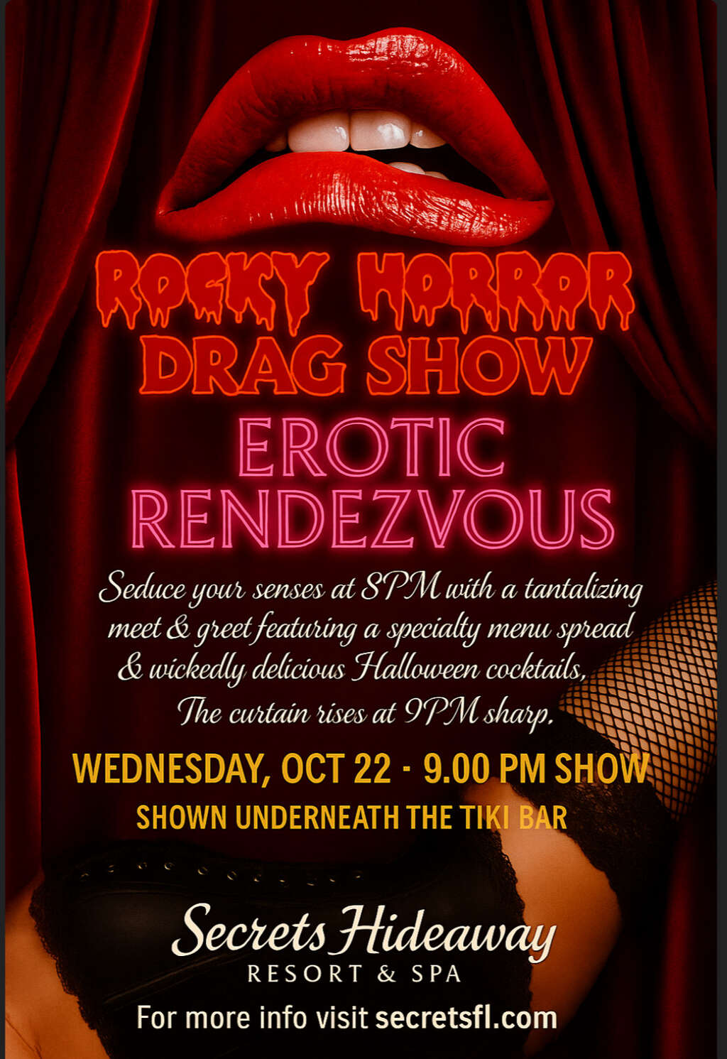 On Wednesday, October 22nd at 9 PM, Secrets Hideaway brings you a wild, sexy, and fabulous twist on the cult classic you know and love. Our Rocky Horror Drag Show reimagines The Rocky Horror Picture Show with fierce performers, outrageous drag looks, and all the cheeky fun you crave.