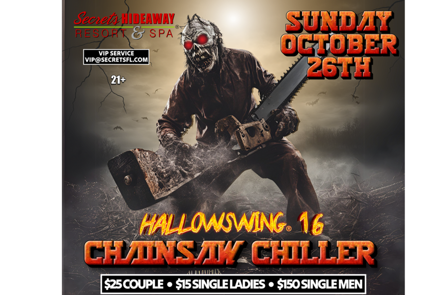 Secrets Hideaway® Presents: Hallowswing® 16 "Chainsaw Chiller" on Sunday, Oct 26th—an event that promises to send shivers down your spine and plunge you into a realm of pure, unadulterated horror. As darkness falls, prepare to enter a world where the roar of chainsaws echoes through haunted corridors and every shadow conceals a lurking terror. This is not for the faint of heart—immerse yourself in a night of spine-tingling scares, eerie soundscapes, and an atmosphere designed to evoke the true essence of a horror fest.