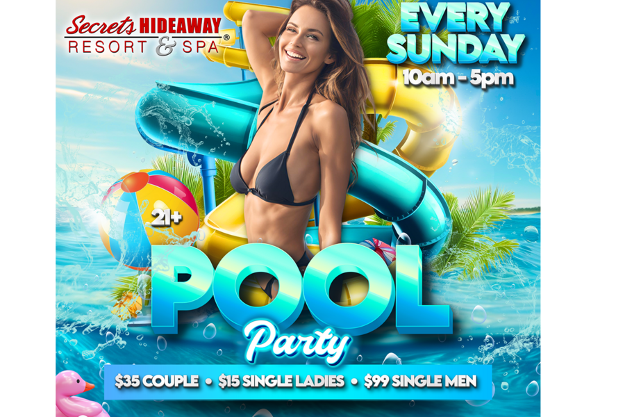 Sundays have never been more liberating! Join us every Sunday from 10 am to 5 pm for the ultimate relaxation and rejuvenation at Secrets Hideaway's Sunday Pool Party. Whether you're extending the weekend fun with Sunday Funday or winding down from a wild adventure, this day is tailored for pure bliss under the warm Florida sun. Forget about swimsuits – at this clothing-optional paradise, come as you are and stretch out in one of our two inviting pools, letting the radiant sunshine kiss your skin as you bask in complete relaxation. Our bubbling hot tubs offer a soothing escape, and the conversation pool provides the ideal setting to make new friends, sparking conversations that linger with the promise of exciting connections.