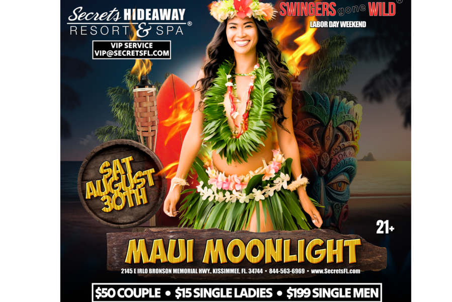 Swingers Gone Wild® Takeover presents "Maui Moonlight" on Saturday, August 30th at Secrets Hideaway—a sultry, tropical escape where the energy of the islands meets the heat of the lifestyle. Slip into your sexiest Hawaiian-inspired outfits and step into a paradise filled with mesmerizing luau dancers, fire performers, and tiki magic that will set the night ablaze. With the moon casting its glow over this steamy island-inspired celebration, the atmosphere will be drenched in passion, flirtation, and electrifying excitement.