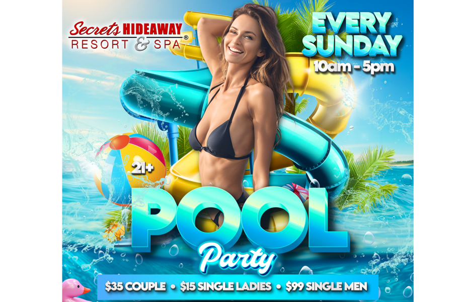 Sundays have never been more liberating! Join us every Sunday from 10 am to 5 pm for the ultimate relaxation and rejuvenation at Secrets Hideaway's Sunday Pool Party. Whether you're extending the weekend fun with Sunday Funday or winding down from a wild adventure, this day is tailored for pure bliss under the warm Florida sun. Forget about swimsuits – at this clothing-optional paradise, come as you are and stretch out in one of our two inviting pools, letting the radiant sunshine kiss your skin as you bask in complete relaxation. Our bubbling hot tubs offer a soothing escape, and the conversation pool provides the ideal setting to make new friends, sparking conversations that linger with the promise of exciting connections.