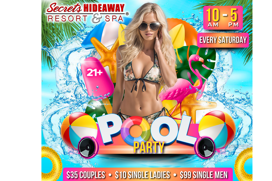 At the Saturday Pool Party, the atmosphere is charged with an electrifying blend of sensuality and sunshine. For those seeking the ultimate in luxury and privacy, reserving a pool-side cabana offers eight hours of opulent relaxation, where you can bask in the sun-kissed ambiance and indulge in arousing fun. Alternatively, slip away to the inviting playrooms, where you can create your own heat and explore the depths of your desires. Whether you're lounging in luxury, dancing under the open sky, or discovering the intimate corners of Secrets Hideaway, the Saturday Pool Party promises a day of unbounded pleasure, liberating experiences, and unforgettable connections with like-minded souls. Dive into the weekend with a splash of excitement, celebrating summer in the sexiest, most enticing way imaginable.