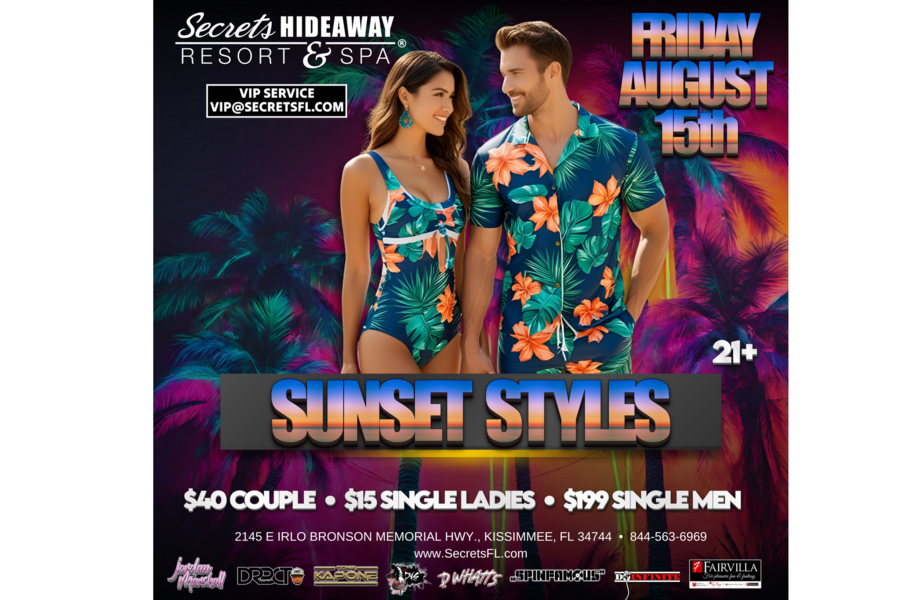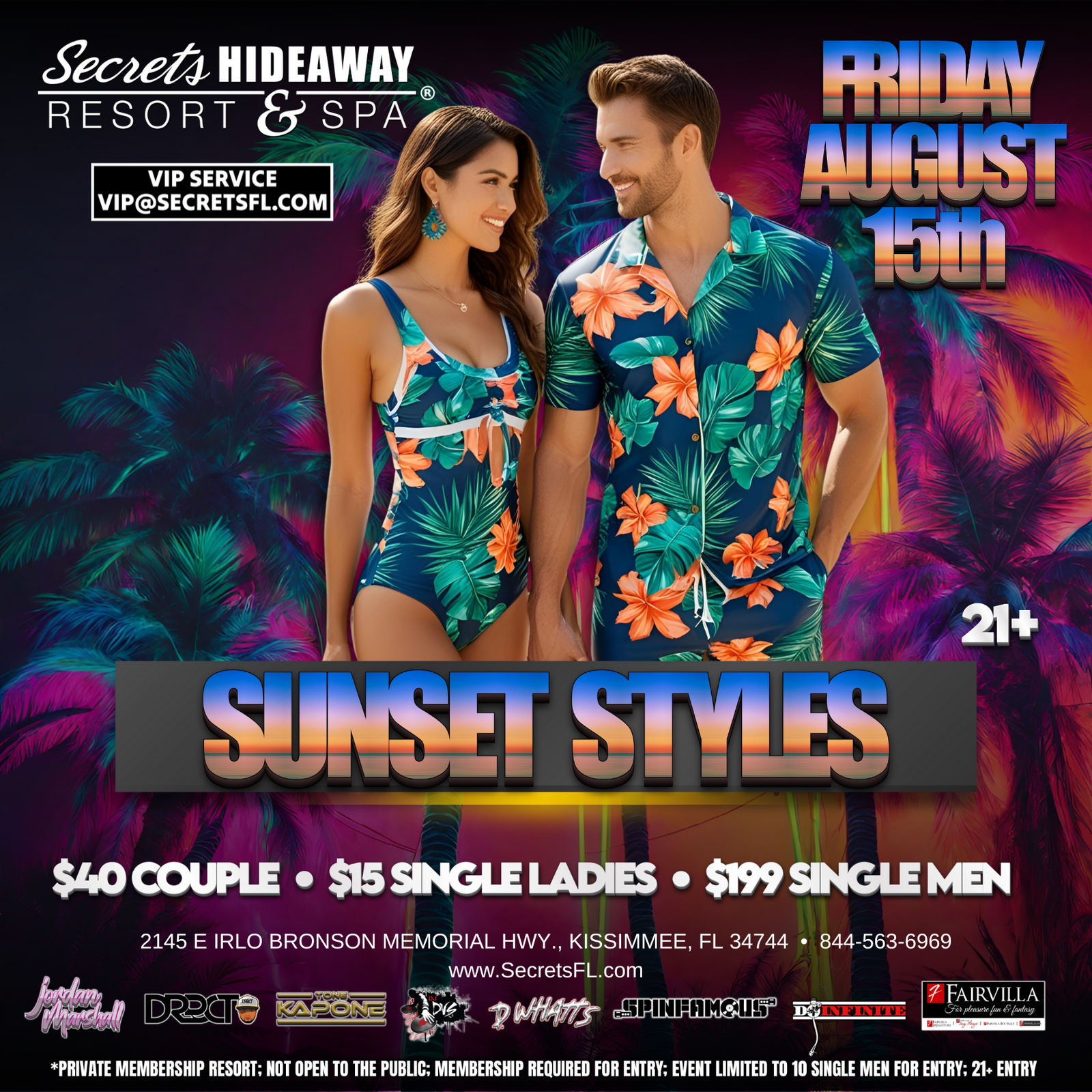Get ready to turn heads at "Sunset Styles" on Friday, August 15th at Secrets Hideaway—a night where golden hour glow meets red-hot fashion and sensual expression. As the sun dips below the horizon, the party heats up with sexy, stylish looks inspired by the vibrant colors and carefree vibes of summer evenings. Whether you’re rocking flowing resort wear, daring beach-chic outfits, or barely-there silhouettes that shimmer in the fading light, this is your chance to strut your stuff and show off your sunset style.