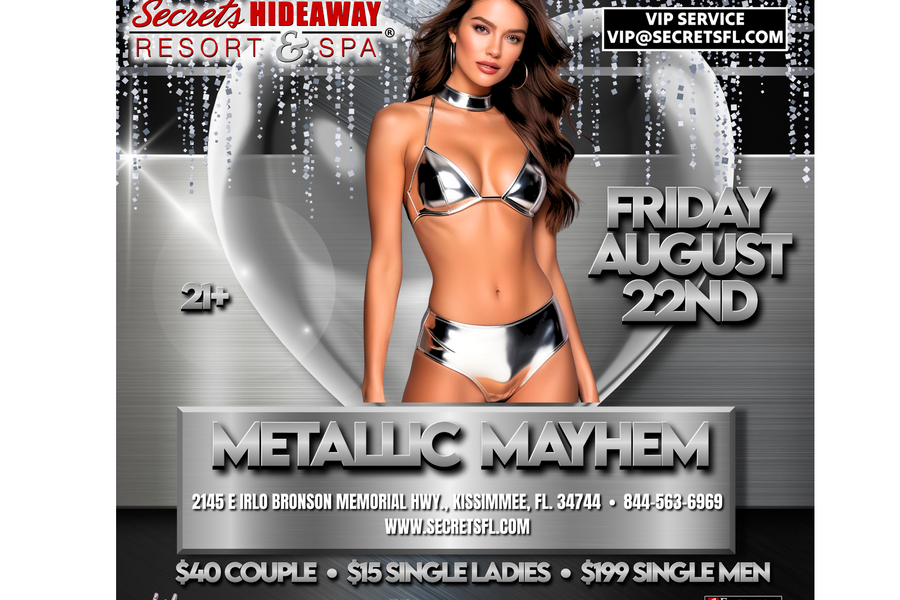 Get ready to shine at "Metallic Mayhem" on Friday, August 22nd at Secrets Hideaway—a night where chrome, shimmer, and high-gloss glamour collide with bold, sexy energy. Slip into your most radiant silver, gold, or holographic attire and let your body reflect the light and the heat of the night. Whether you're sparkling in sequins, wrapped in latex, or glowing in metallic mesh, this is your chance to dazzle and dominate the dance floor in true lifestyle fashion.