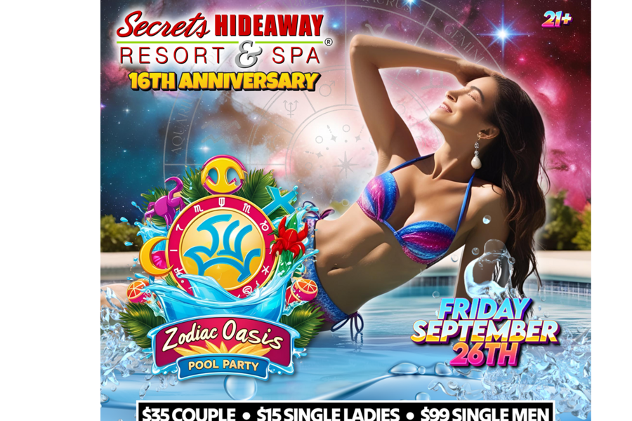 Kick off the celebration in cosmic style with the "Zodiac Oasis Pool Party" on Friday, September 26th, from 10am – 5pm, as we launch Secrets Hideaway's 16th Anniversary Weekend! This celestial-themed poolside bash invites you to embrace your zodiac energy—whether you’re a fiery Aries, sensual Taurus, or mysterious Scorpio, there’s a place in the stars (and in the pool) just for you. Slip into your sexiest swimwear, soak up the Florida sun, and prepare for a day of fun, flirty vibes, and high-energy beats.