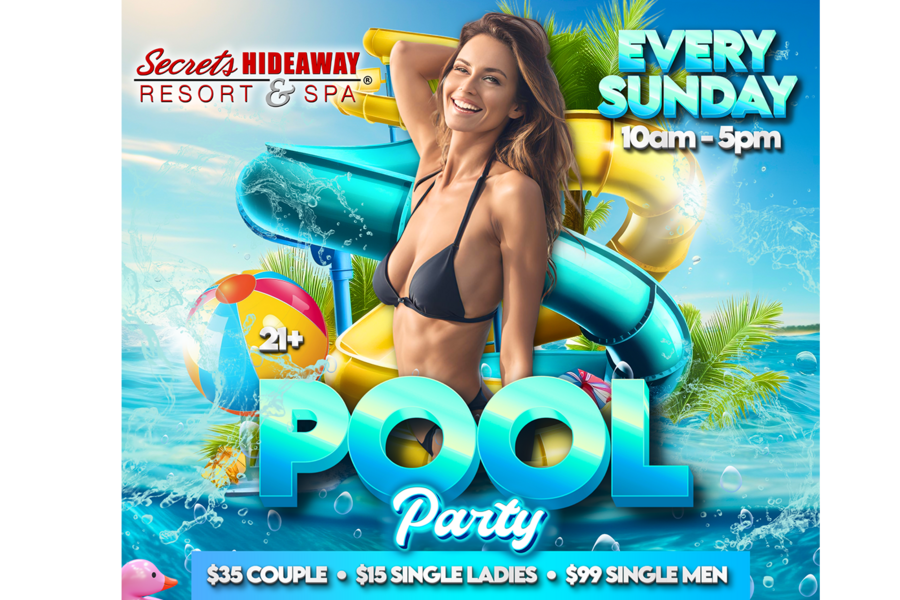 Sundays have never been more liberating! Join us every Sunday from 10 am to 5 pm for the ultimate relaxation and rejuvenation at Secrets Hideaway's Sunday Pool Party. Whether you're extending the weekend fun with Sunday Funday or winding down from a wild adventure, this day is tailored for pure bliss under the warm Florida sun. Forget about swimsuits – at this clothing-optional paradise, come as you are and stretch out in one of our two inviting pools, letting the radiant sunshine kiss your skin as you bask in complete relaxation. Our bubbling hot tubs offer a soothing escape, and the conversation pool provides the ideal setting to make new friends, sparking conversations that linger with the promise of exciting connections.