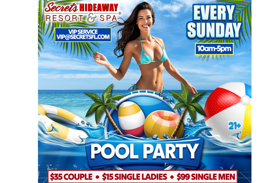 Sundays have never been more liberating! Join us every Sunday from 10 am to 5 pm for the ultimate relaxation and rejuvenation at Secrets Hideaway's Sunday Pool Party. Whether you're extending the weekend fun with Sunday Funday or winding down from a wild adventure, this day is tailored for pure bliss under the warm Florida sun. Forget about swimsuits – at this clothing-optional paradise, come as you are and stretch out in one of our two inviting pools, letting the radiant sunshine kiss your skin as you bask in complete relaxation. Our bubbling hot tubs offer a soothing escape, and the conversation pool provides the ideal setting to make new friends, sparking conversations that linger with the promise of exciting connections.