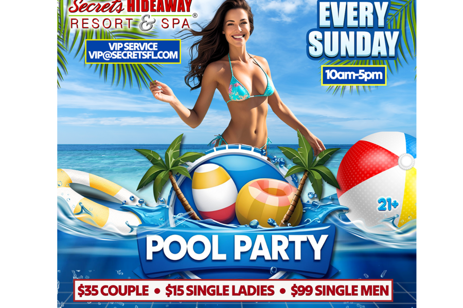 Sundays have never been more liberating! Join us every Sunday from 10 am to 5 pm for the ultimate relaxation and rejuvenation at Secrets Hideaway's Sunday Pool Party. Whether you're extending the weekend fun with Sunday Funday or winding down from a wild adventure, this day is tailored for pure bliss under the warm Florida sun. Forget about swimsuits – at this clothing-optional paradise, come as you are and stretch out in one of our two inviting pools, letting the radiant sunshine kiss your skin as you bask in complete relaxation. Our bubbling hot tubs offer a soothing escape, and the conversation pool provides the ideal setting to make new friends, sparking conversations that linger with the promise of exciting connections.