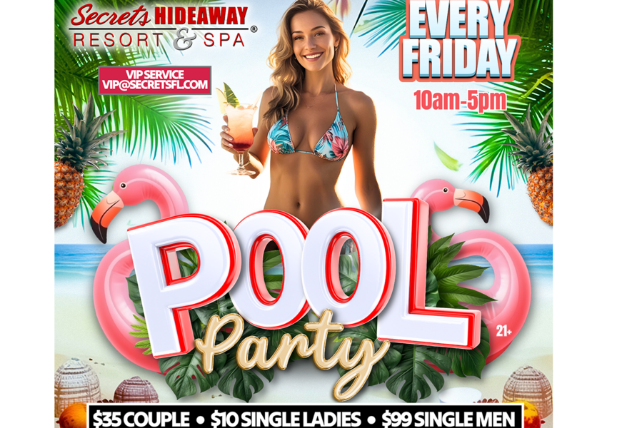The Friday Pool Party at Secrets Hideaway invites you to unwind and celebrate the start of the weekend amidst a vibrant, tropical atmosphere. For those seeking a touch of luxury, renting a cabana offers eight hours of pure indulgence, providing a comfortable and intimate space to enjoy the company of your favorite friends. It's an opportunity to escape the routine, bask in the warm Florida sun, and connect with like-minded souls in an environment that exudes a sense of freedom and camaraderie. Starting your weekend off right with the Friday Pool Party guarantees an unforgettable experience, surrounded by the laughter, energy, and excitement of your Secret's friends, making it the ideal way to set the tone for an amazing weekend ahead.