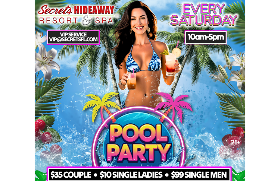 Kick off your weekend in style at the Friday Pool Party, an enticing affair hosted every Friday from 10 am to 5 pm at Secrets Hideaway Resort & Spa. Immerse yourself in the ultimate daytime indulgence as you join Orlando's most exhilarating clothing-optional pool party. From the moment the clock strikes 10 am, the party comes alive with refreshing cold drinks served at the lively tiki bar, a delectable lunch and dinner menu, and the infectious beats spun by our professional DJs, setting the perfect backdrop for a day of carefree fun and relaxation. At Secrets Hideaway, we offer not just a pool party but an experience where you can revel in the sun, enjoy tantalizing food and drinks, and groove to your favorite tunes, all in the company of friendly, open-minded individuals.