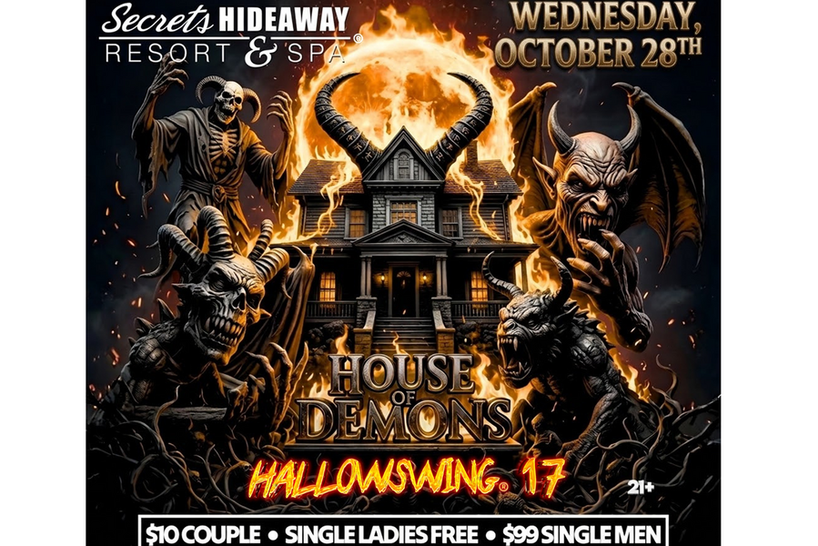 Hallowswing® 17 descends deeper into darkness at Secrets Hideaway Resort & Spa on Wednesday, October 28th with “House of Demons,” a night where the gates of the underworld are torn wide open and something evil walks among us. The resort will be consumed by flickering red light, smoke-filled shadows, and the sound of distant screams as demons, fallen angels, and possessed souls roam freely through the night. Every corner hides something watching… waiting… whispering. Those who enter the House of Demons may feel the chill of something unseen, as if the darkness itself is alive and pulling you closer.