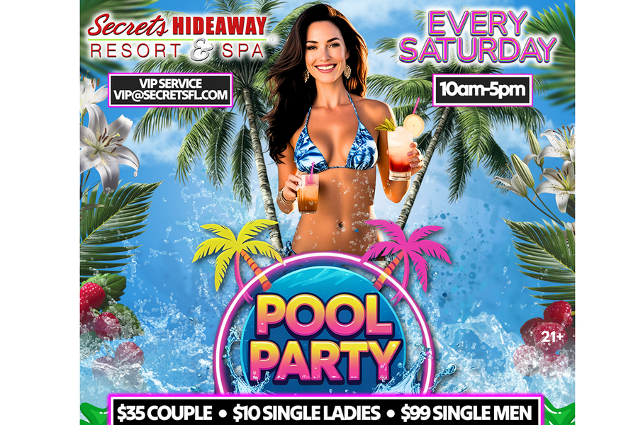 Get ready to indulge in the epitome of Saturday bliss at Secrets Hideaway's exclusive Saturday Pool Party, held every Saturday from 10 am to 5 pm. Shed your inhibitions along with your clothes and immerse yourself in the epitome of sensual freedom at Orlando's hottest clothing-optional pool event. With the sun beaming down and the temperature rising, Secrets Hideaway invites you to strip down, cool off, and join your sexiest friends for a day of pure, unadulterated pleasure. Picture yourself lounging poolside, drink in hand, surrounded by the rhythmic beats of hot music and the sizzling presence of even hotter friends. Secrets Hideaway Resort and Spa's courtyard pool area, complemented by two outdoor tiki bars, forms the perfect backdrop for this seductive rendezvous, where you can let go, be free, and celebrate the heat of summer in the most alluring way possible.
