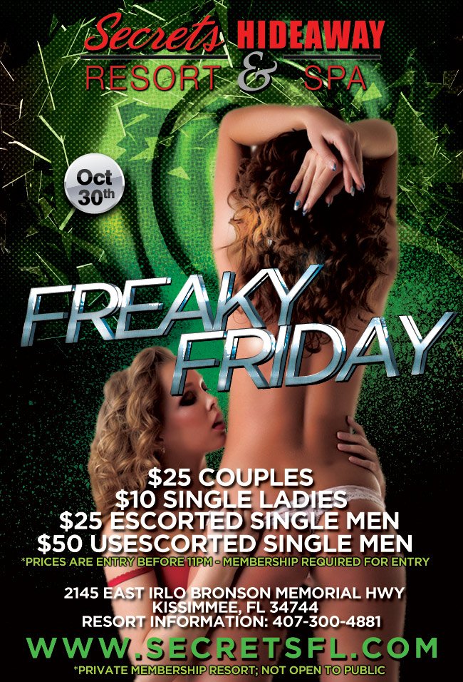 Horrid creatures and the walking dead will tear off your flesh so they can be fed. Zombies stumble into the night at this year's pre HallowSwing Members Appreciation under the moonlight. Secrets Hideaway will protect you my dear from the walking dead that fill you with fear. With a vengeful grin and soulless eyes, the zombies take pleasure in your screams and cries. Come join Secrets Hideaway as we fire the night up for our pre HallowSwing bash - Freaky Friday.