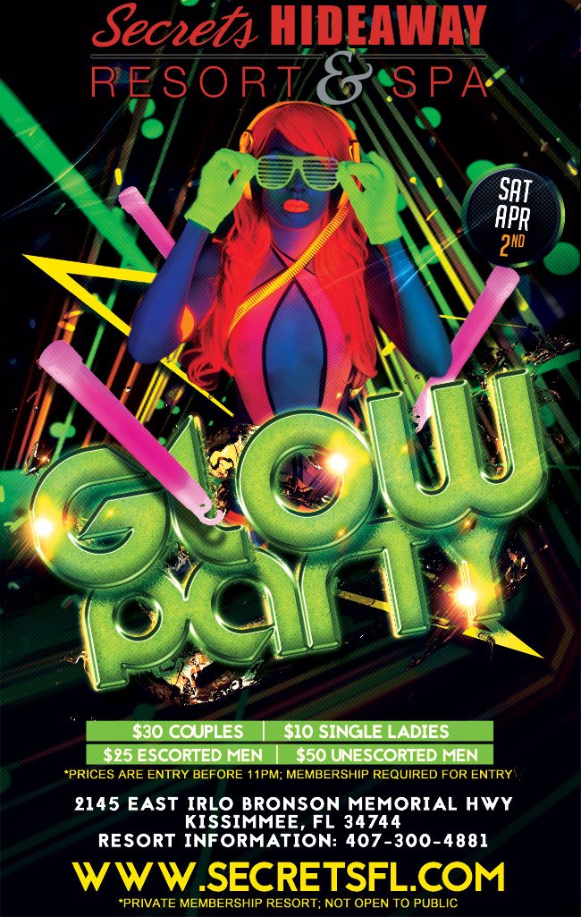 Are YOU ready to stand out? Our black light parties combine our premium nightclub experience with an added visual element. Join Secrets Hideaway for one of our best themed parties. That's right our fantastic GLOW Party!!! Secrets Hideaway is hosting a unique party that fuses together music, special effects, hot people and glowing colors. Step into a mind blowing combination which creates interaction, excitement and enjoyment from start to finish. Our spectacular party has a dramatic impact on the crowd, as they go absolutely crazy!!!! Our black light parties get BIGGER every time we throw one! Escape into an immersive environment of GLOW imagery. Ladies and gentlemen we want you to wear as much florescent swag as physically possible. Feel free to bring any glow materials you have to this outstanding event.
