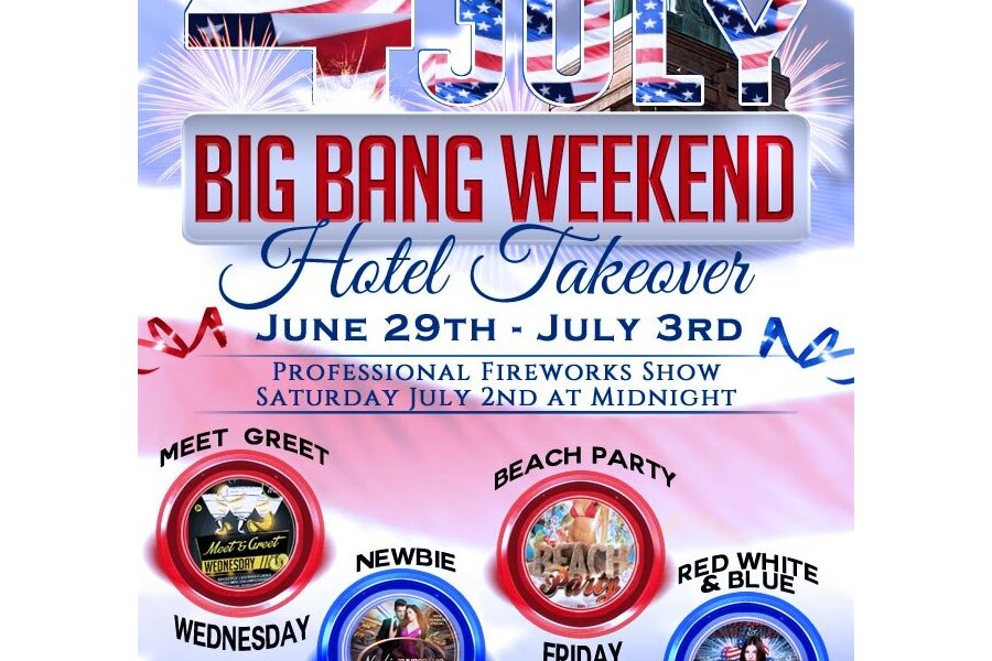 Welcome Summer!! Oh how we have missed you. On June 29th through July 2nd Secrets Hideaway is pleased to bring you our Third Annual Big Bang Weekend. This year we have added another day of hedonistic fun. Come celebrate your independence with clothing optional pool parties, naked volleyball, and nightly parties!! Club Secret opens every night at 7:30 as well as our complimentary dinner buffet.