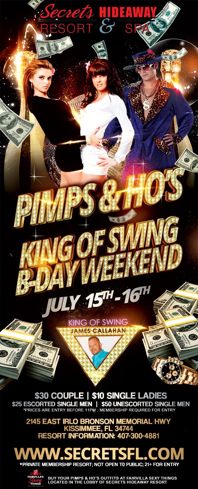There are many Hot and Sexy events we have in July, but our absolute favorite is James’s Birthday because he knows how to throw one hell of a party!!! What better way to celebrate the King of Swing than to throw a 2 day PARTY!! On Friday night, we start off with a Sexy Net Party. This party is about SKIN and all the sexiest fabrics we can see on your bodies. Get some rest because Saturday morning Secrets Hideaway is throwing there always steamy clothing optional pool party. Make sure you save some energy because Saturday night everyone will be pimpin’ at our Pimps & Ho’s Party. At midnight, everyone will raise their Jager shots as we toast Mr. Secrets Hideaway, the King of Swing, the Pimp Daddy himself… James!!! Don’t just HEAR about this party, you need to BE at this party!!