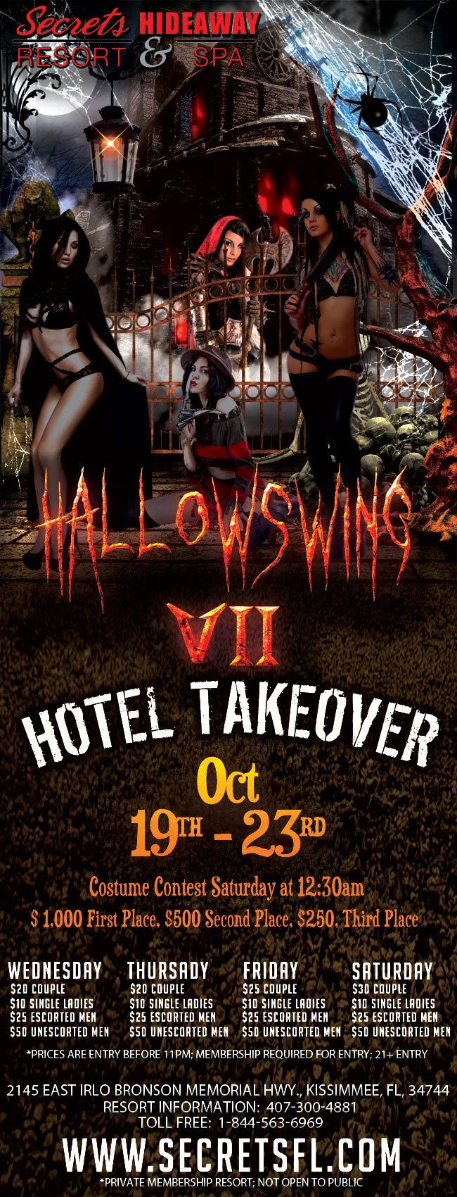 Ladies and gentlemen, here is the event you have been waiting all year for! HallowSwing VII. Every year, the Secrets Hideaway Team brainstorms on how to make HallowSwing bigger and better. This year, we are taking HallowSwing in a totally different direction. We want to see how sexy and sensual you can get those costumes. To say thank you for the 7 years our members have supported HallowSwing, we are cutting the entry price by $20. You read that right. Don’t forget about the costume contest at 12:30 on Saturday where 1st place receives $1000, 2nd place receives $500, and 3rd place receives $250!!! There is also a contest for best decorated hotel door and window. Come early to decorate.