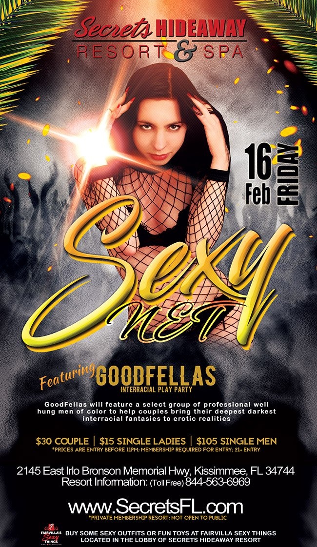 Ladies, do you like the taste of chocolate? Have you ever wondered what it would be like to play with a man of color? Secrets Hideaway has what you are looking for. Friday night, for your delight, the GoodFellas will be here!!! GoodFellas will feature a select group of 15 professional well hung men of color to help couples bring their deepest darkest interracial fantasies to reality.